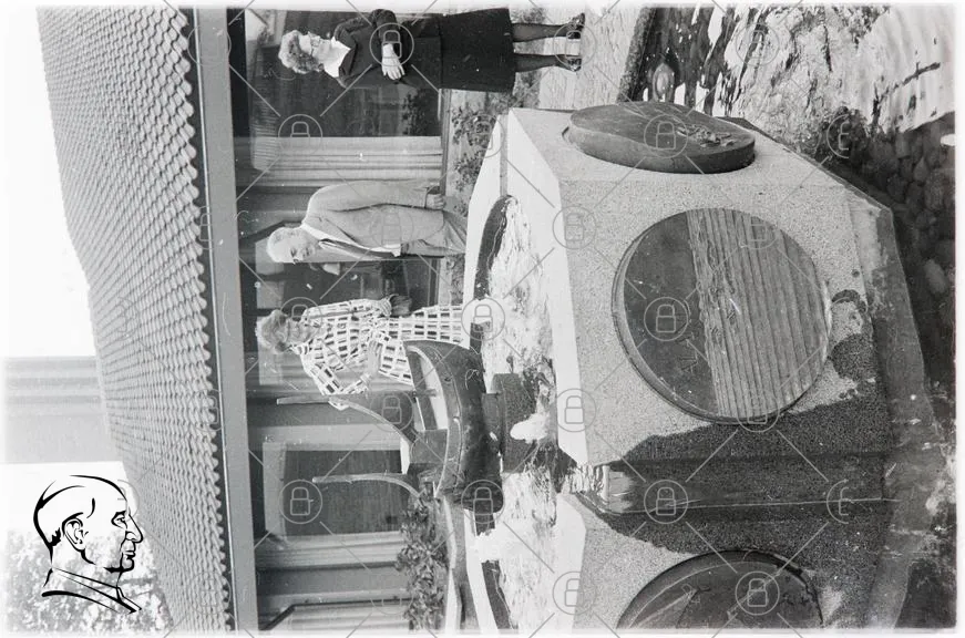 brunn, vatten, staty, trädgård, människor, kläder, svartvitt, byggnad, dekoration, fontän, utomhus, 1900-tal, stil, samspel, design, arkitektur, möte, tradition, kultur, historia, landskap, natur, konst, skulptur, elegans, form, struktur, detaljer, miljö, socialt