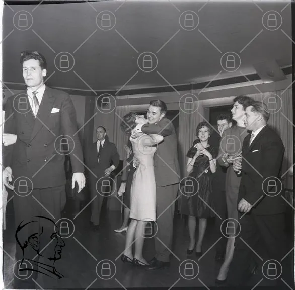 dans, fest, 1960-tal, klänning, kostym, par, kyss, socialt, glädje, eleganta, svartvitt, inomhus, människor, dansgolv, interaktion, skratt, stil, festligheter, romantik, samvaro