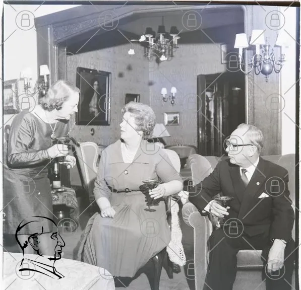 svartvit, äldre, människor, inomhus, samtal, kläder, möbler, 1960-tal, fest, glas, leende, interiör, konst, belysning, sittande, stående, socialt, sällskap, kvinnor, män, vintage, traditionell, hemtrevlig, eleganta, uttryck, nostalgisk, familj, vänner, samling, minnen