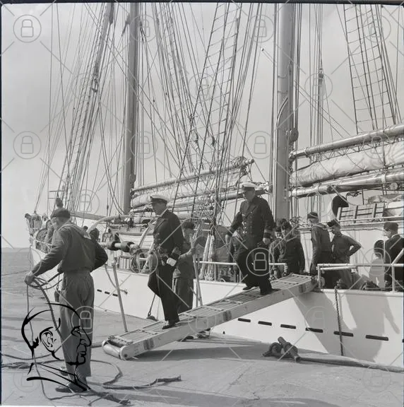 segelfartyg, besättning, hamn, rep, segel, marin, kläder, 1900-tal, träbåt, segling, manliga, historisk, sjöfart, båtliv, kapten, mast, rigg, vågor, sky, svartvitt, fotografi, traditionell, arbete, sjöman, lastning, avstigning, båt, kaj, segelduk, sjö