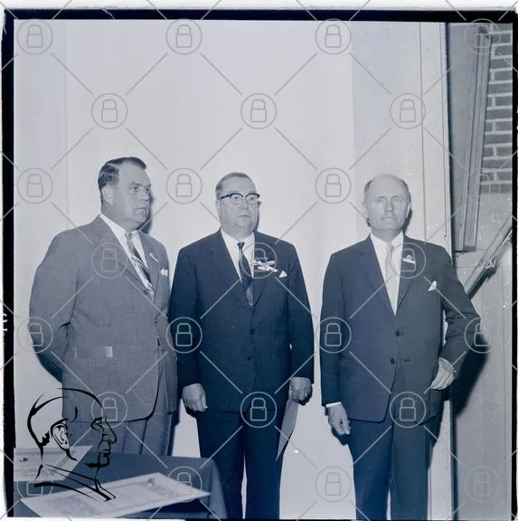 tre män, svartvitt, kostymer, slipsar, möte, formell, stående, inomhus, vägg, dokument, 1960-tal, affärsmän, fotografi, traditionell, kläder, ansiktsuttryck, samarbete, presentation, stil, historia