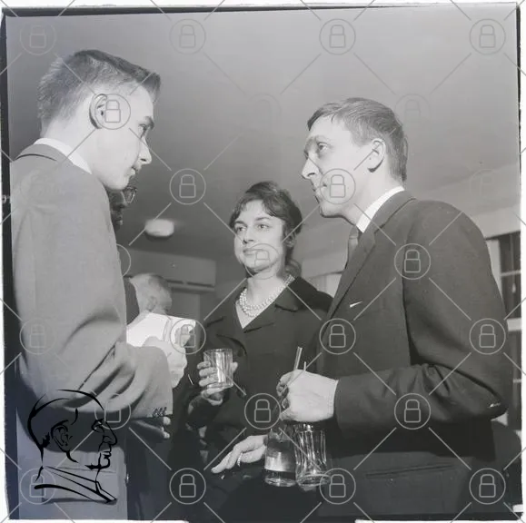 fest, mingel, kläder, kostymer, drinkar, 1960-tal, socialt, samtal, kvinnor, män, svartvitt, eleganta, smycken, glas, interiör, leenden, nätverkande, stil, mode, vintage, klassiskt, sällskap, evenemang, ungdomar, professionellt, relationer, atmosfär, traditionellt, samvaro, diskussion