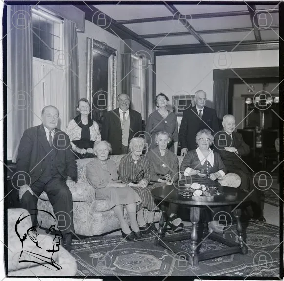 grupp, människor, äldre, inomhus, sittande, stående, möbler, soffa, bord, rum, kläder, svartvitt, familj, samling, porträtt, interiör, traditionell, stil, ansikten, leenden, dekorationer, väggar, fönster, golv, tidsepok, gemenskap, minnen, samhörighet, historia