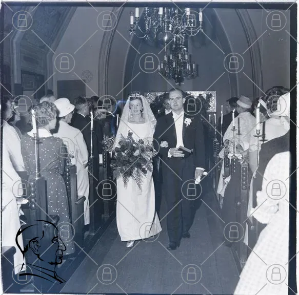 bröllop, brud, brudgum, kyrka, gäster, blommor, klänning, kostym, ljus, bänkar, tradition, fest, ceremoni, fotografi, svartvit, dekoration, glädje, familj, vänner, festligheter, kärlek, minnen, 1950-tal, stil, elegans, bröllopsklänning, brudslöja, bröllopspar, procession, festkläder