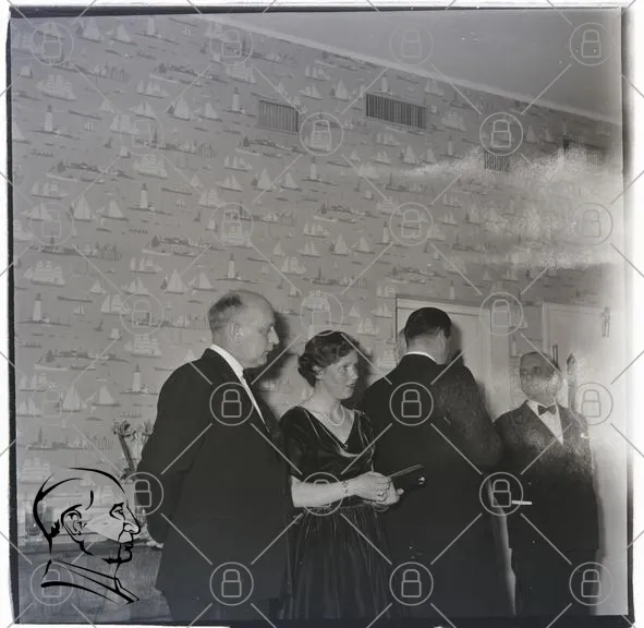 fest, människor, kostymer, klänning, tapet, segelbåtar, inomhus, formellt, grupp, konversation, svartvitt, 1950-tal, socialt, evenemang, elegant, herrar, dam, interiör, väggdekoration, stående