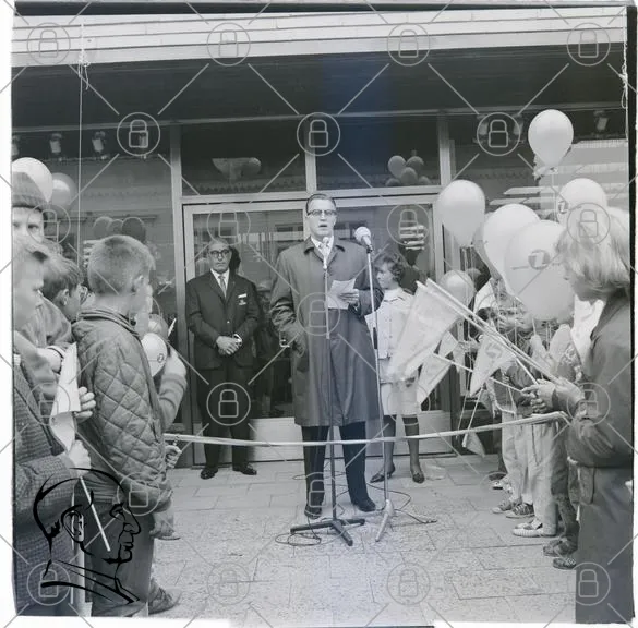 talare, barn, ballonger, flaggor, invigning, publik, mikrofon, kläder, 1960-tal, evenemang, ceremoni, vuxna, spänning, samling, utomhus, stående, fotografering, tradition, fest, gemenskap, uppvaktning, spänning, historia, minnen, socialt, samarbete, glädje, festligheter, uppträdande, aktivitet
