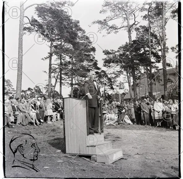 talare, utomhus, publik, träd, talarstol, svartvitt, evenemang, människor, skog, kläder, sommar, samling, park, natur, historisk, 1900-tal, man, åhörare, socialt, möte, landskap, byggnad, grupp, aktivitet, allmänhet, scen, mikrofon, trappa, stående, formellt