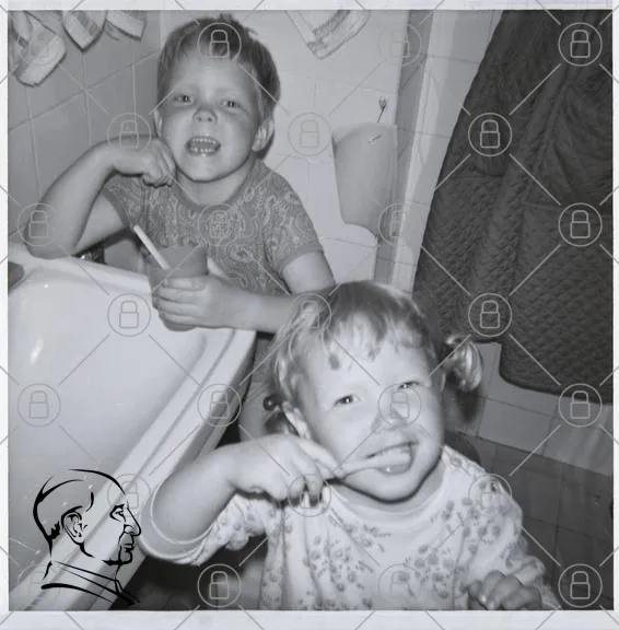 barn, tandborstning, badrum, leende, svartvit, syskon, spegel, tandkräm, glas, handfat, hygien, lekfullt, kläder, inredning, toalettpapper, handduk