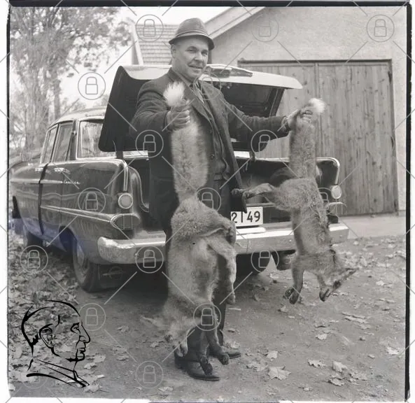 man, bil, räv, jakt, kläder, hatt, 1950-tal, svartvitt, landskap, natur, skog, fångst, bakgård, träd, höst, djur, tradition, fotografi, gammal, retro, vilt, avbildning, människor, utomhus, föremål, stativ, bilar, skinn, jaktutrustning, samling