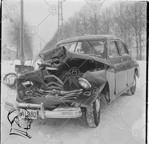 bil, krock, skada, vinter, snö, gammal, svart, motorfordon, trasig, väg, träd, landskap, olycka, registreringsskylt, A4980, 1950-tal, foton, svartvitt, fordon, trafik, säkerhet