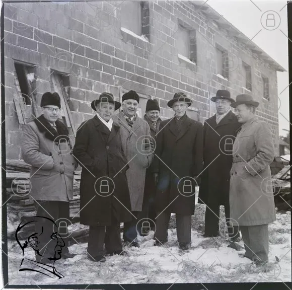 historisk, svartvit, grupp, män, kostymer, hattar, byggnad, snö, utomhus, 1900-tal, porträtt, traditionell, kläder, samling, fotografering, landskap, arkitektur, gammal, stil, vänner, affärsmän, möte, minnen, nostalgi, kultur, samhälle, tidsepok, gemenskap, ansikten, uttryck