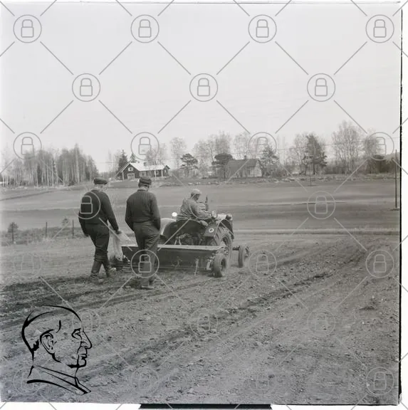 jordbruk, traktor, fält, män, plöja, landskap, skog, gård, arbete, traditionellt, odling, maskiner, 1950-tal, svartvitt, rural, natur, väder, landsbygd, samarbete, jord, sådd