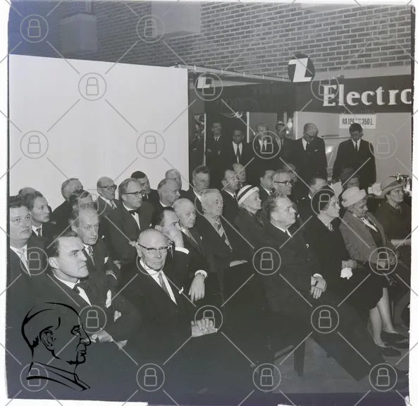 möte, konferens, publik, män, kvinnor, kostymer, slipsar, hattar, svartvitt, 1960-tal, presentation, åhörare, företag, samling, evenemang, bakgrund, vägg, stolar, bänkar, affärsmän, diskussion, professionell, formell, grupp, samarbete, teknik, industri, elektro, företagande
