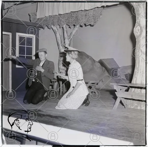 teater, skådespelare, scen, kostymer, 1950-tal, svartvitt, föreställning, publik, drama, man, kvinna, trä, rekvisita, kläder, hattar, bänk, bakgrund, träd, hus, ljus, uttryck, gest, knä, dans, traditionell, kultur, konst, underhållning, teaterkonst, scenkonst