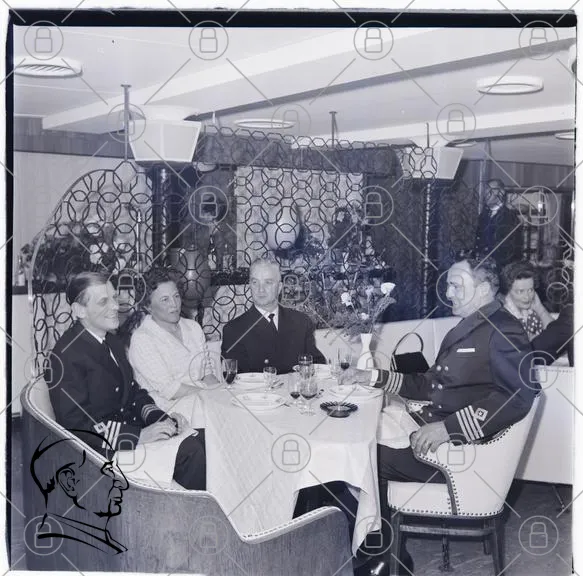 militär, officer, middag, sällskap, restaurang, 1940-tal, kläder, bord, glas, samtal, inredning, svartvitt, socialt, par, kvinnor, män, fest, mat, dryck, stolar, dekoration, interiör, samvaro, tradition, stil, elegans, historisk, samling, grupp, vänskap