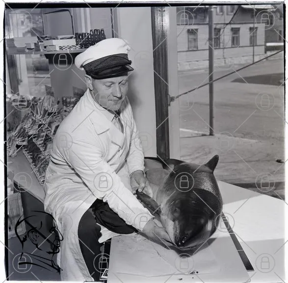 man, fiskare, fisk, butik, svartvitt, 1900-tal, skärbräda, hav, sjömat, kappa, hatt, fönster, affär, traditionell, arbete, mat, säl, skaldjur, hantverk, professionell, handarbete, lokal, försäljning, råvara, livsmedel, historisk, miljö, hantverkare, yrke