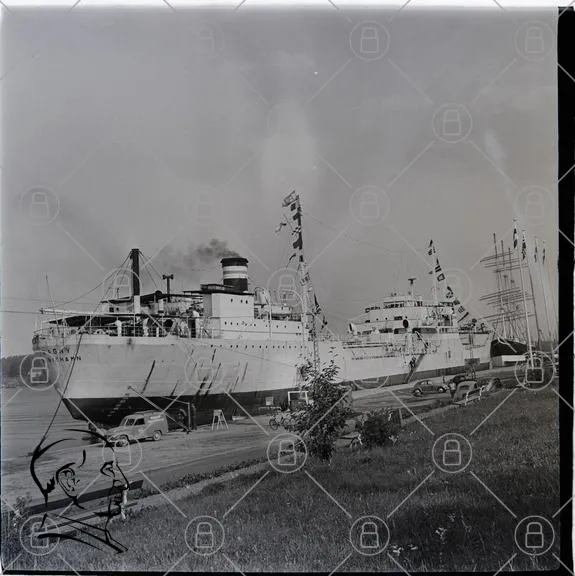 fartyg, skepp, hamn, flaggor, rök, lastfartyg, byggarbetsplats, trä, väg, grönska, svartvitt, 1900-tal, industri, transport, sjöfart, kaj, lastning, utrustning, maskiner, bilar, träd, landskap, vatten, byggnader, arbete, marin, tradition, historia, segel