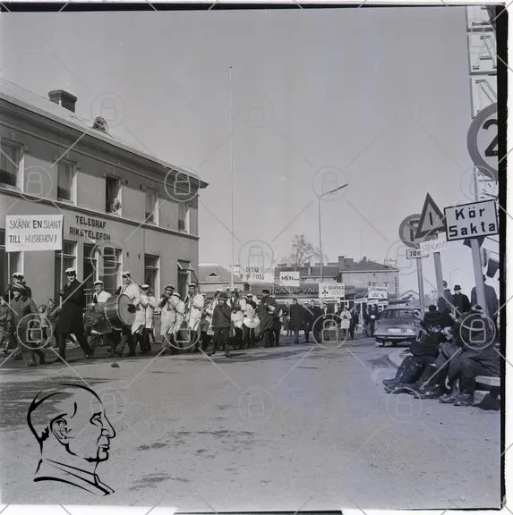 parad, march, människor, byggnader, skyltar, trafik, historisk, svartvit, gator, trummor, kostymer, fest, samling, folkmassa, 1960-tal, kultur, tradition, musik, tåg, festligheter, samhälle, aktivitet, fotografering, gatumiljö, människor i rörelse, festlig, evenemang, folkliv, stadsbild, folklig