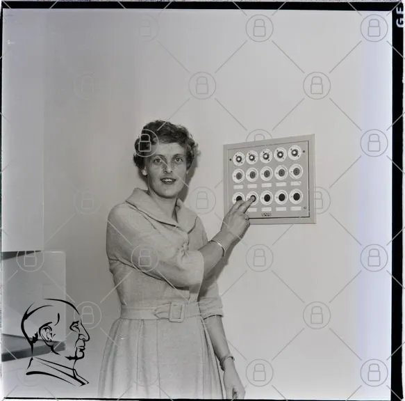 kvinna, 1950-tal, svartvitt, knappanel, teknik, vintage, klänning, inomhus, leende, retro, forskning, experiment, laboratoriemiljö, historisk, vetenskap, interaktion, kontrollpanel, design, mode, porträtt