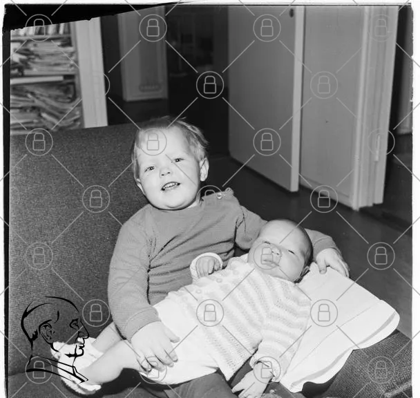 barn, syskon, soffa, leende, baby, svartvitt, inomhus, hem, kläder, mjuk, gosig, familj, kärlek, barndom, trygghet, lek, skratt, minnen, fotografi, nostalgi