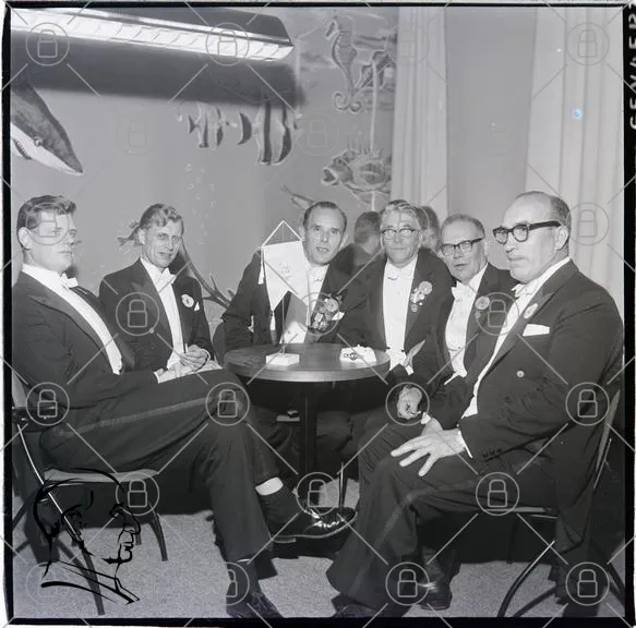 män, kostymer, fest, sittande, bord, leenden, eleganta, kläder, svartvitt, bakgrund, dekorationer, glasögon, festligheter, grupp, porträtt, 1900-tal, stil, tradition, samling, evenemang, gala, formella, utställning, sällskap, mänsklig interaktion, socialt, festkläder, tidsepok, fotografi, minnen
