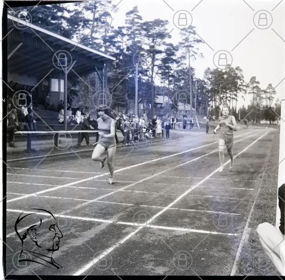 löpare, tävling, sport, kvinnor, stadion, publik, träning, hastighet, motion, lopp, 1960-tal, svartvitt, idrott, banor, prestation, ungdomar, gemenskap, natur, träd, gymnastik, tävlingskläder, fokus, energi, spänning, loppresultat, tradition, evenemang, samling, glädje, uthållighet