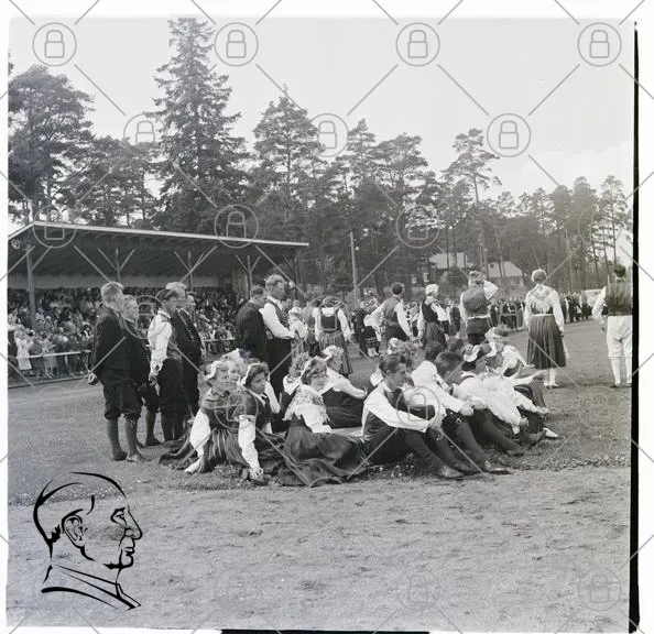 folkdräkt, dans, tradition, festival, samling, publik, utomhus, kultur, evenemang, män, kvinnor, historisk, Sverige, 1900-tal, glädje, gemenskap, sport, uppträdande, natur, träd, gräs, scen, kläder, fest, musik, dansare, fotografering, minnen, festligheter, folklig