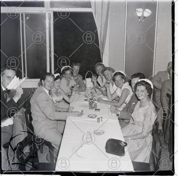 fest, middag, sällskap, kläder, 1950-tal, bord, leenden, kvinnor, män, dekoration, blommor, hattar, servetter, svartvitt, socialt, samling, festligheter, glas, skratt, tradition, stil, interiör, ljus, gemenskap, fotografi, nostalgi, minnen, festmåltid, elegans