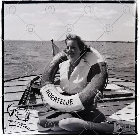 kvinna, livboj, Norrtelje, båt, hav, sommar, sjö, sittande, leende, svartvitt, klänning, himmel, moln, vatten, flagga, segelbåt, fritid, utomhus, resa, skärgård
