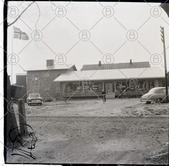 byggnad, butik, bil, flagga, Norge, landsbygd, gammal, svartvit, väg, människor, fönster, tak, träd, gård, skylt, historia, 1900-tal, arkitektur, landskap, affär, hus, gårdsplan, fotogen, tradition, kultur, samhälle, transport, detalj, miljö, utomhus