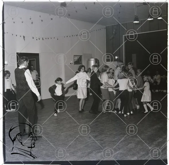dans, barn, vuxna, fest, svartvitt, 1970-tal, dansgolv, glädje, samvaro, musik, socialt, aktivitet, kläder, leenden, rörelse, inomhus, evenemang, tradition, gemenskap, festlokal, minnen