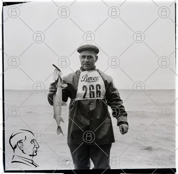 fiskare, fisk, tävling, nummer, Limex, hav, svartvitt, kläder, hatt, fångst, man, 266, vatten, sport, tradition, 1900-tal, fiskeutrustning, leksak, natur, utomhus