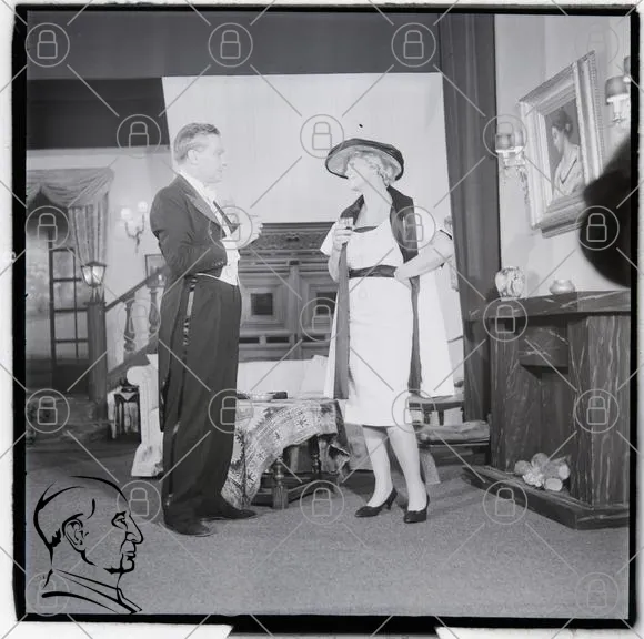 man, kvinna, kläder, kostym, klänning, hatt, scen, inredning, 1950-tal, svartvitt, teater, dialog, möbler, belysning, stil, glamour, skådespelare, föreställning, interiör, vintage
