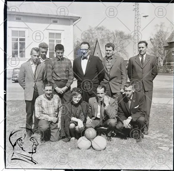grupp, män, kvinnor, fotboll, bollar, svartvitt, kläder, 1950-tal, porträtt, utomhus, byggnad, träd, sport, leende, tradition, samarbete, gemenskap, ungdomar, stil, fotografering, historia, nostalgi, landskap, aktivitet, glädje, samling, ansikten, kultur, idrott