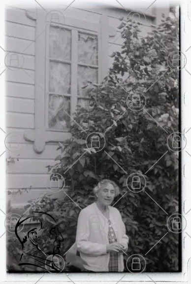 kvinna, trädgård, buskar, gammal, svartvit, byggnad, fönster, kläder, leende, porträtt, natur, utomhus, vintage, historia, växter, gammal fotografi, tradition, familj, sommar, landskap