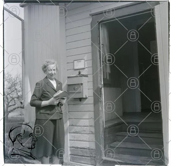 kvinna, hus, dörr, brevlåda, bok, kläder, svartvitt, trappa, fönster, trädgård, gammal, porträtt, utomhus, 1900-tal, stil, mode, leende, besök, hem, landsbygd