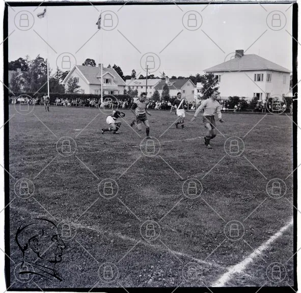 fotboll, match, spelare, gräsplan, publik, hus, flaggor, sport, utomhus, domare, målområde, idrott, tävling, lag, fotbollsmatch, åskådare, fotbollsplan, aktivitet, rörelse, sportkläder