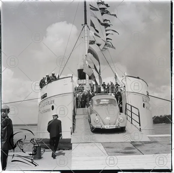färja, bil, flaggor, människor, 1950-tal, transport, hav, lastning, resande, svartvitt, båtfärd, historisk, landskap, kläder, båtar, väg, däck, passagerare, sjöfart, fordon, last, sjö, hamn, kultur, tradition, fotografering, retro
