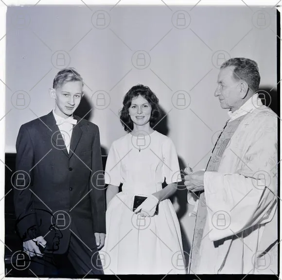 pojke, flicka, präst, bröllop, fest, klänning, kostym, svartvitt, ceremoni, ungdomar, 1960-tal, tradition, familj, glädje, samling, porträtt, högtid, kläder, leende, minne