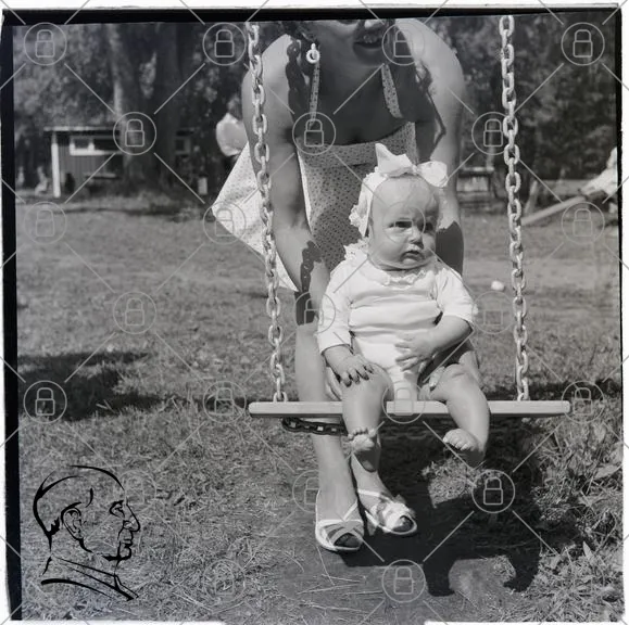 barn, gunga, mamma, lekplats, sommar, klänning, vit, hårband, gräs, svartvitt, ansikte, leende, barndom, familj, utomhus, nöje, sitta, barnvagn, skugga, lek, minnen, glädje, tidlös, nostalgi, fotografi, barnkläder, skratt, lekfullhet, natur, barnvagn