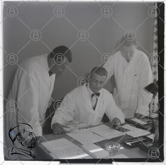 läkare, forskning, laboratoriemiljö, dokument, skrivbord, vitrockar, män, samarbete, medicin, 1900-tal, kontor, anteckningar, belysning, professionellt, analys, vetenskap, studier, observation, medicinsk utrustning, papper, glas, skrivmaskin, noteringar, diskussion, arbetsmiljö, team, experiment, noggrannhet, kunskap, utbildning