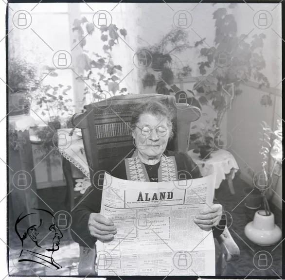 gammal kvinna, tidning, Åland, glasögon, inomhus, växter, stol, svartvitt, traditionell klädsel, läsning, historia, kultur, hem, interiör, fotografi, 1900-tal, nostalgi, lokal nyhet, samhälle, avkoppling, familj, minnen, vardag, äldre, tidningsläsning, lugn, atmosfär, hemtrevligt, vintage, porträtt