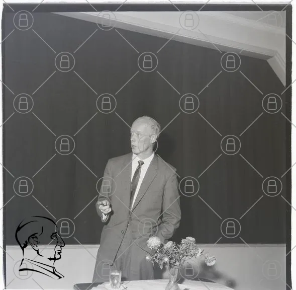man, kostym, presentation, talare, blommor, bord, glas, svartvitt, inomhus, kläder, professionell, mikrofon, bakgrund, affärsmöte, 1900-tal, stil, formell, gest, fokus, uttryck, stående, interaktion, publik, information, kommunikation, utbildning, konferens, stilren, elegans