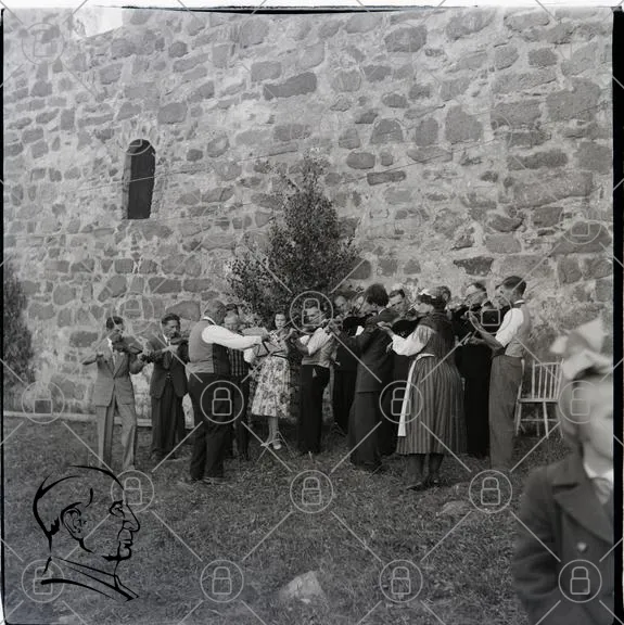 grupp, människor, kläder, traditionell, utomhus, stenmur, träd, barn, instrument, fest, svartvitt, gammal, samling, fotografering, kultur, glädje, musik, historisk, familj, vänner, samhörighet, leenden, klänningar, kostymer, pojkar, flickor, vuxna, barn, stolar
