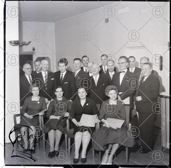 gruppfoto, män, kvinnor, 1950-tal, kostymer, klänningar, leenden, inomhus, möte, porträtt, traditionell, svartvitt, samling, stolar, dokument, fest, formell, äldre, yngre, gemenskap, minnen, historia, stil, kläder, ansikten, samarbete, evenemang, socialt, familj, vänner