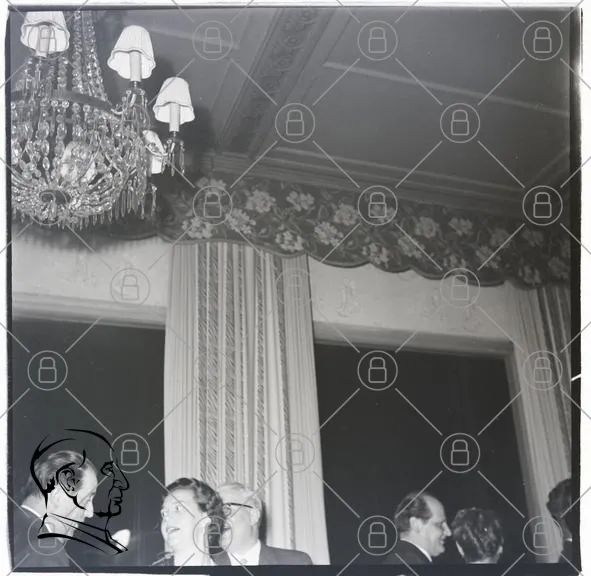 kristallkrona, människor, interiör, gardiner, takdekoration, samtal, formell klädsel, fest, socialt event, 1960-tal, svartvitt foto, elegant, rum, taklampa, dekoration, tapet, fönster, grupp, mingel, historisk