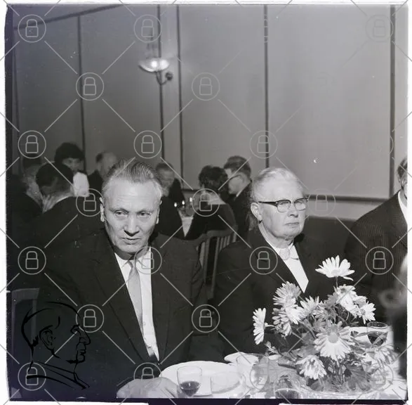 middag, fest, människor, bord, kläder, blommor, glas, mat, svartvitt, 1960-tal, samling, samtal, eleganta, sittande, leenden, dekorationer, ljus, bakgrund, ansikten, uttryck