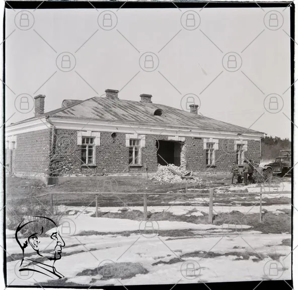 byggnad, tegel, tak, fönster, dörr, snö, mark, traktorer, människor, landskap, gammal, utomhus, arbete, renovering, historia, landsbygd, grönska, byggprojekt, vinter, byggmaterial