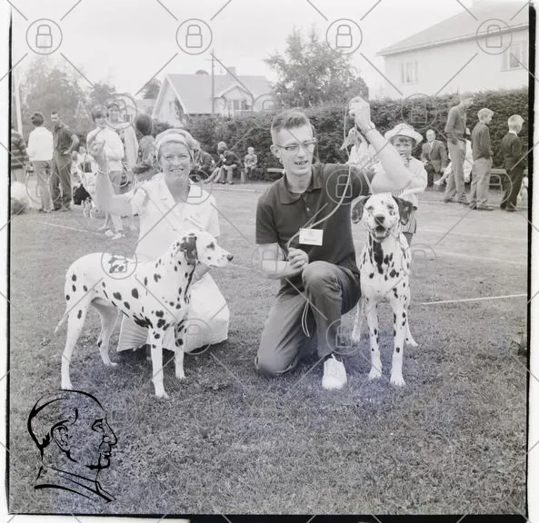 hundar, dalmatiner, utställning, människor, gräsmatta, kläder, leksak, park, 1960-tal, hundskötsel, tävling, sällskapsdjur, vit, svart, publik, fotografering, man, kvinna, hundkoppel, hundar i parken, hundutställning
