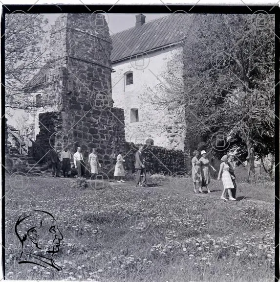historisk, byggnad, stenhus, människor, promenad, grönska, träd, sommar, kläder, barn, vuxna, landskap, gammal, natur, fotot, svartvitt, kultur, tradition, gård, stenar, växtlighet, skugga, sol, familj, gemenskap, aktivitet, utomhus, minnen, tidsepok, landsbygd